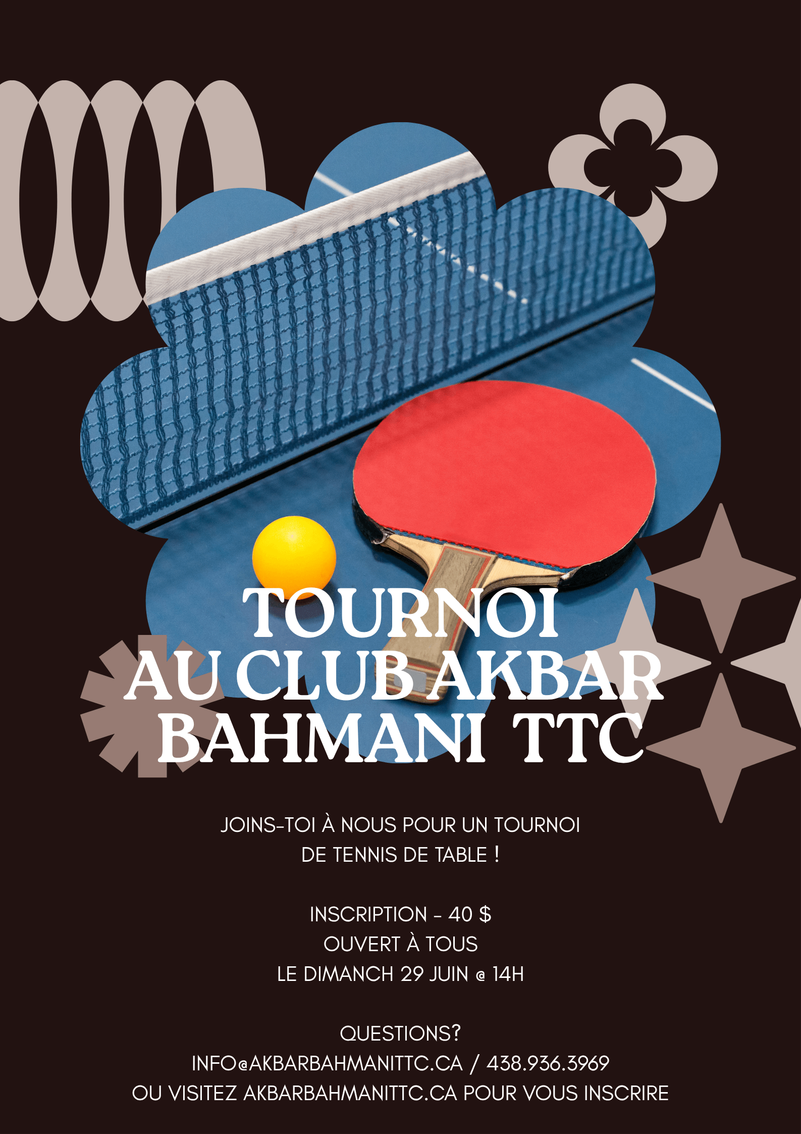 Club Akbar Bahmani TTC 9580, boul. de l'Acadie, MontréalWe invite you to the tournament that will take place on August 25, 2025 @ 2 pm at Akbar Bahmani TTC. Open to players with a ranking below 500.