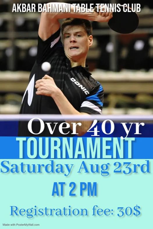 We invite you to participate to the tournament for 40 yr old and + that will take place on Saturday, August 23 at 2 pm at Akbar Bahmani TTC in Montreal!