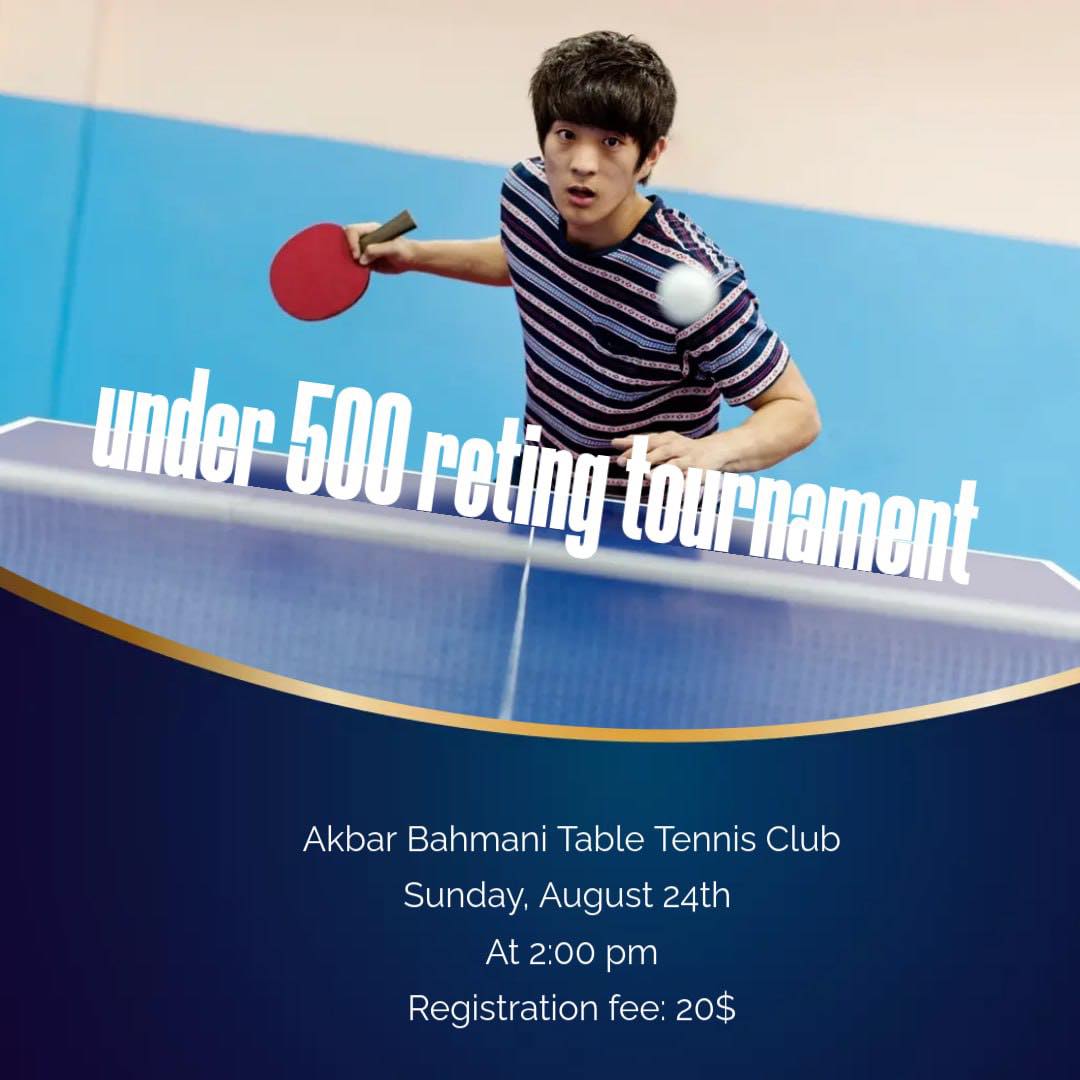 We invite you to the tournament that will take place on August 25, 2025 @ 2 pm at Akbar Bahmani TTC. Open to players with a ranking below 500.